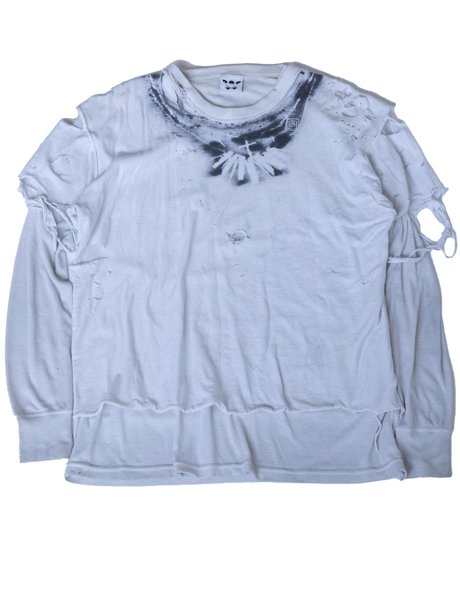 double layered shirts sewn and distressed into this one of a kind piece. The exterior of the garment was tattooed and spray-painted all over. also has thumbholes and fits on the tighter size.