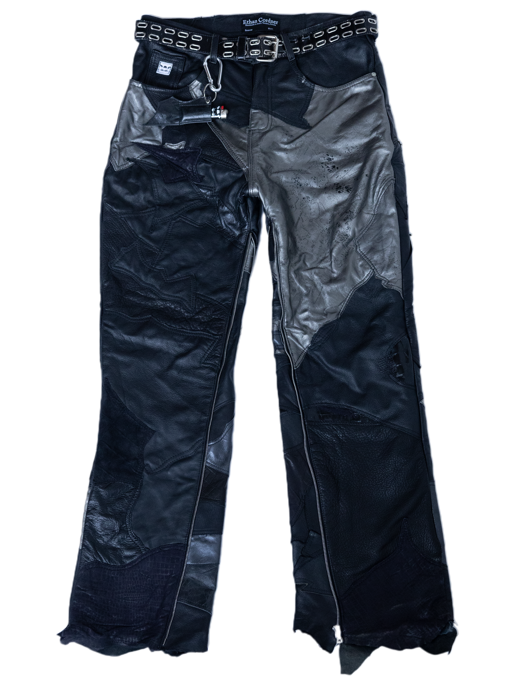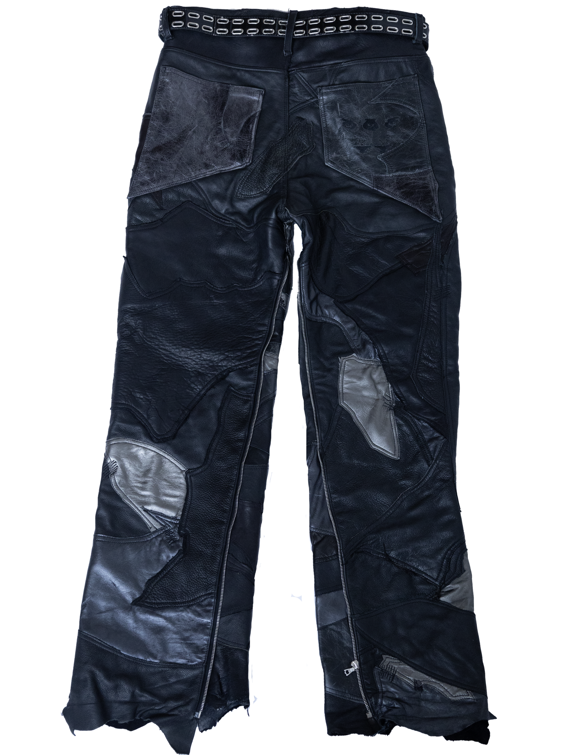 13 different genuine animal leathers meticulously sewn over denim. Types of leather include:
